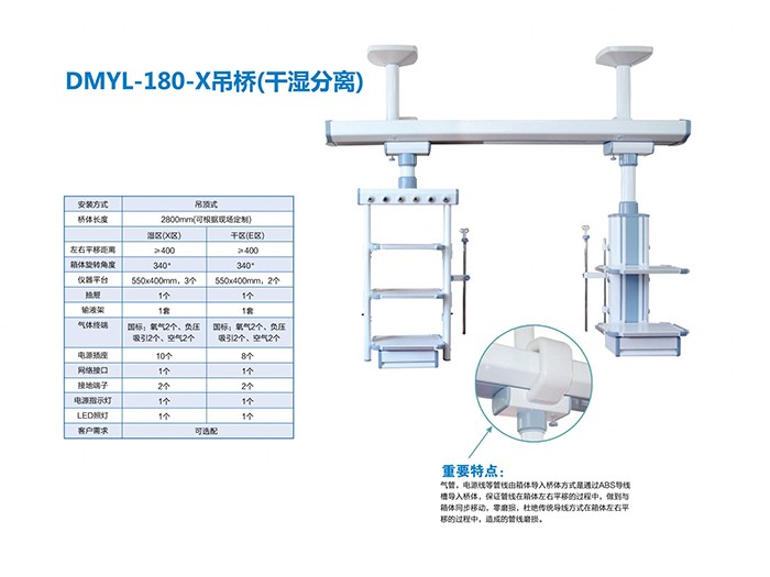 接著,我們為大家推薦山東德曼醫療生產的心血管內科CCU醫用吊塔。在監護病房中,通常會使用醫用吊橋,因為這種吊橋是一個橫梁,兩側分別帶有箱體,從而為放置監測儀器提供了更多的空間和位置。吊塔上還可提供氣體等,可根據病房的實際需求進行選擇,箱體上還配備了電插口,為監測儀器和設備提供電源。